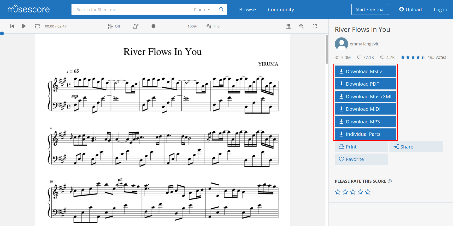download sheet music from musescore.com for free, no login or Musescore Pro required