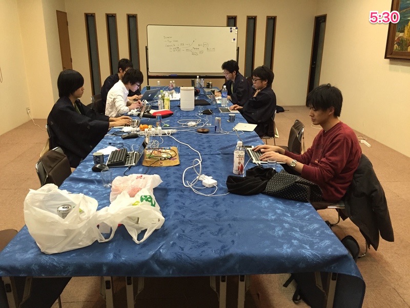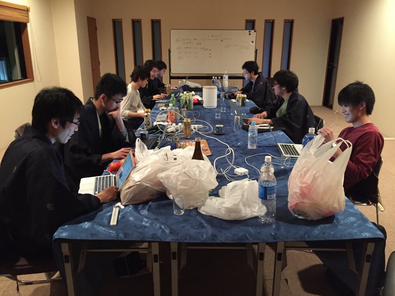 温泉を堪能した後は、いよいよ開発再開です。浴衣に着替えてはいますが、完全にガチモードです。各自、自分のタスクに没頭しました。