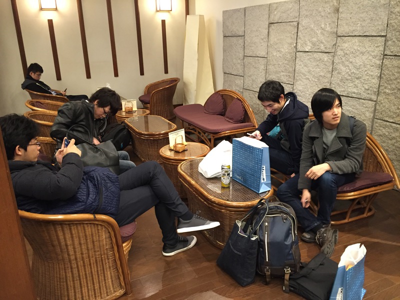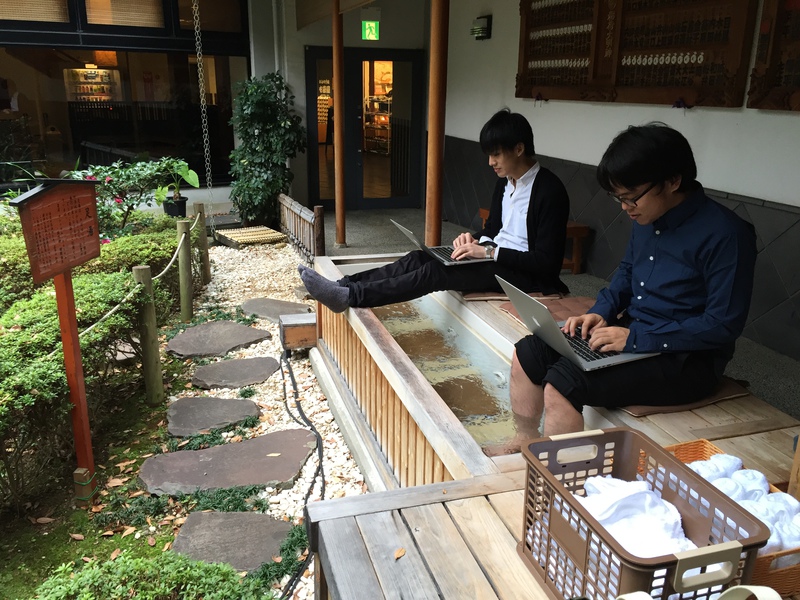 宿からはバスで駅へ向かうので、バスの時間までは思い思いの過ごし方をします。エントランスでゆっくりしたり、足湯に浸かって癒されたり。足湯はとても気持ち良くて、コーディングにもぴったりです。