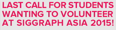 Sign-up as a Student Volunteer and be in the middle of all the fun and action at SIGGRAPH Asia 2015. As a Student Volunteer, you will support the SIGGRAPH Asia 2015 Conference Programs and Exhibition, and have the opportunity to meet and learn from experienced professionals, creators, educators, and visionaries in the industry. In addition, the benefits you will receive as a Student Volunteer includes a full conference pass to SIGGRAPH Asia 2015, exclusive access to Student Volunteer special sessions, and eligibility for complimentary housing in Kobe, Japan throughout the duration of the event.