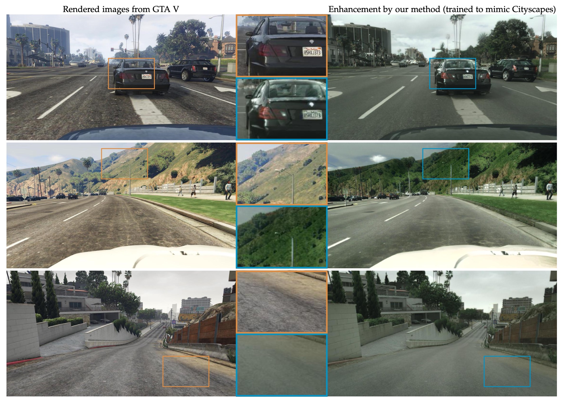 We present an approach to enhancing the realism of synthetic images. The images are enhanced by a convolutional network that leverages intermediate representations produced by conventional rendering pipelines. The network is trained via a novel adversarial objective, which provides strong supervision at multiple perceptual levels. We analyze scene layout distributions in commonly used datasets and find that they differ in important ways. We hypothesize that this is one of the causes of strong artifacts that can be observed in the results of many prior methods. To address this we propose a new strategy for sampling image patches during training. We also introduce multiple architectural improvements in the deep network modules used for photorealism enhancement. We confirm the benefits of our contributions in controlled experiments and report substantial gains in stability and realism in comparison to recent image-to-image translation methods and a variety of other baselines.