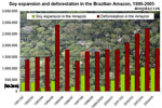 no thumbnail> [ medium ] | Soy expansion in the Brazilian Amazon, 1990-2005 Total deforestation and area of soybean cultivation across states in the Brazilian Amazon. Overall soybean cultivation makes up only a small portion of deforestation, though its role is accelerating. Further, soybean expansion and the associated infrastructure development and farmer displacement is driving deforestation by other actors. Note: some soybean farms are established on already degraded rainforest lands and neighboring cerrado ecosystems. Therefore it would be inappropriate to assume the area of soybean planting represents its actual role in deforestation. context of image |