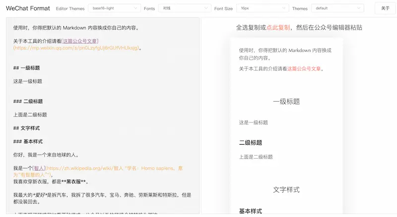 上图左侧的文本框输入 Markdown 文本,右侧立刻显示自动渲染的结果,可以直接复制到微信公众号的编辑器。