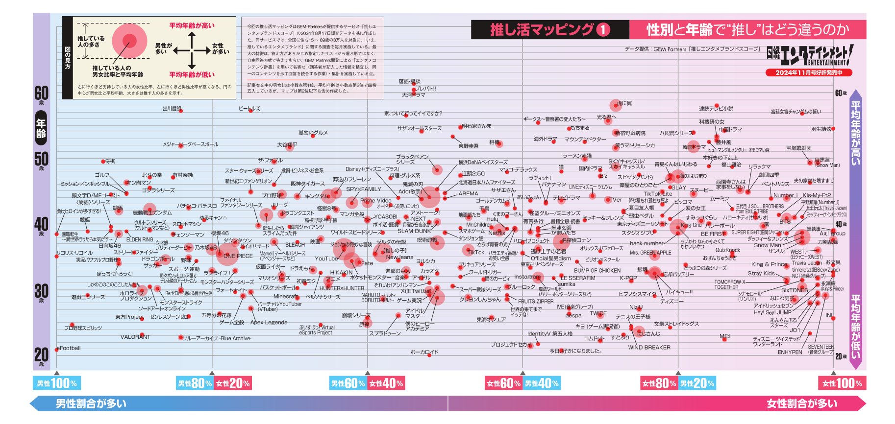 あとパーセンテージじゃなくて人数を見せてくれ。これだと全体数が多いコンテンツも少ないコンテンツも同じ男女比率なら同じ横軸にマッピングされないか?チェンソーマンとかパーセンテージで見るとその位置だとしても人数で言うと女性ファンめちゃくちゃ多いだろ。