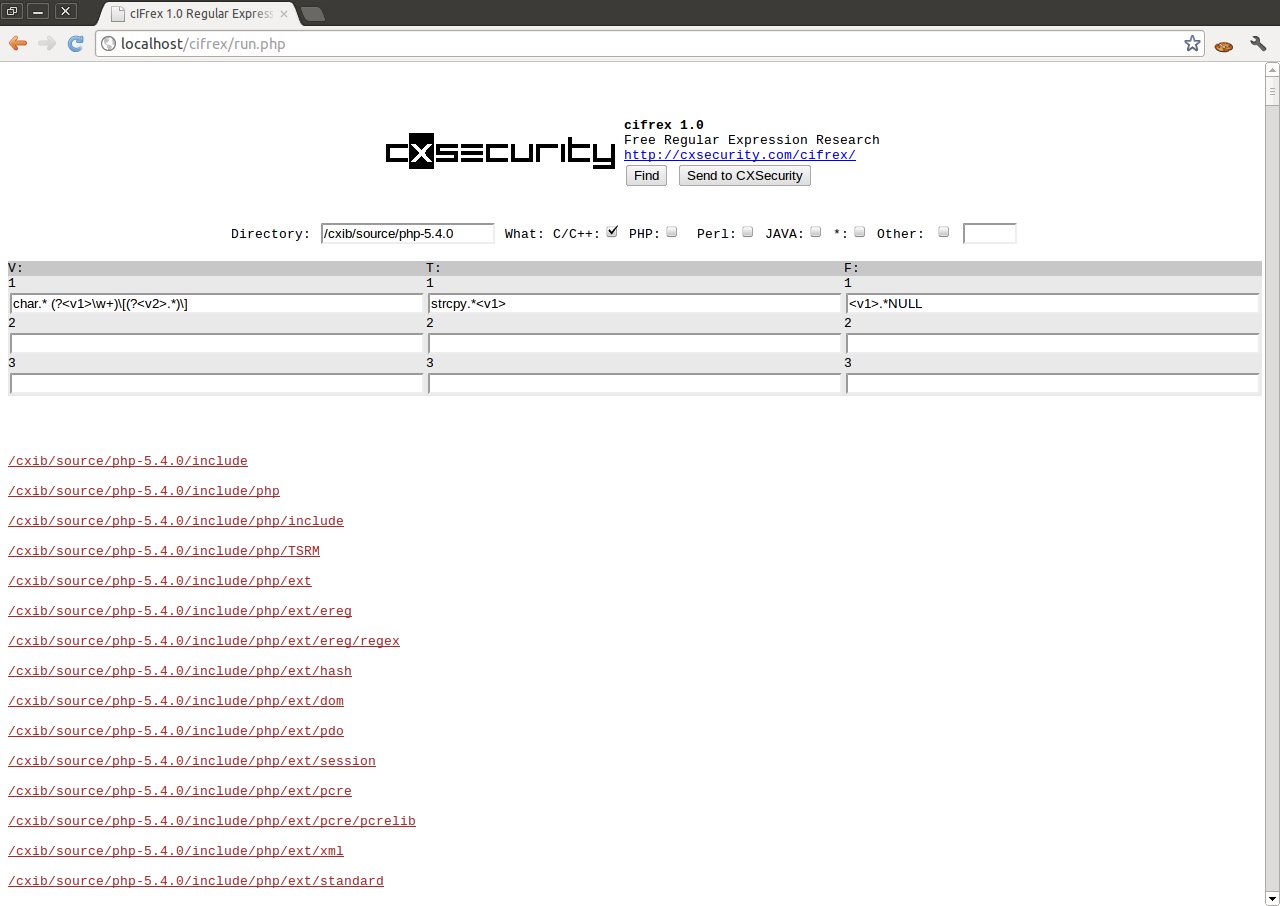 cIFrex is an security tool, which supports search for mistakes in the source code during static code analysis. Using the database of filters based on regular expressions, you can quickly locating the code, in which the probability of failure is high. To be able to use cIFrex search, you should have basic knowlage about regular expressions and static code review. This tool facilitates static code analysis during security audits or finding malicious code by using regular expressions. Some functions in the code may generate a risk, such as for PHP and disable_functions. Do you want to know if any of these features were used in your code?