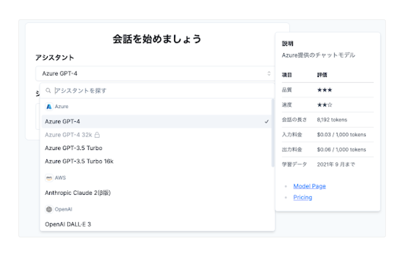 複数の基盤モデルをひとつの画面から簡単に切替えが可能。 ユースケースに合わせて最適なモデルを選択可能。