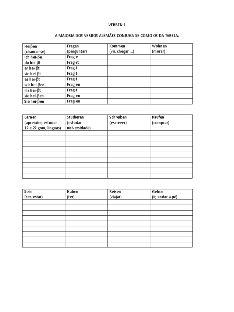 hei-t es hei-t wir hei-en ihr hei-t sie hei-en Sie hei-en Lernen (aprender, estudar 1 e 2 grau, lnguas) Fragen (perguntar) Frag-e Frag-st Frag-t Frag-t Frag-t Frag-en Frag-t Frag-en Frag-en Kommen (vir, chegar ...) Wohnen (morar)