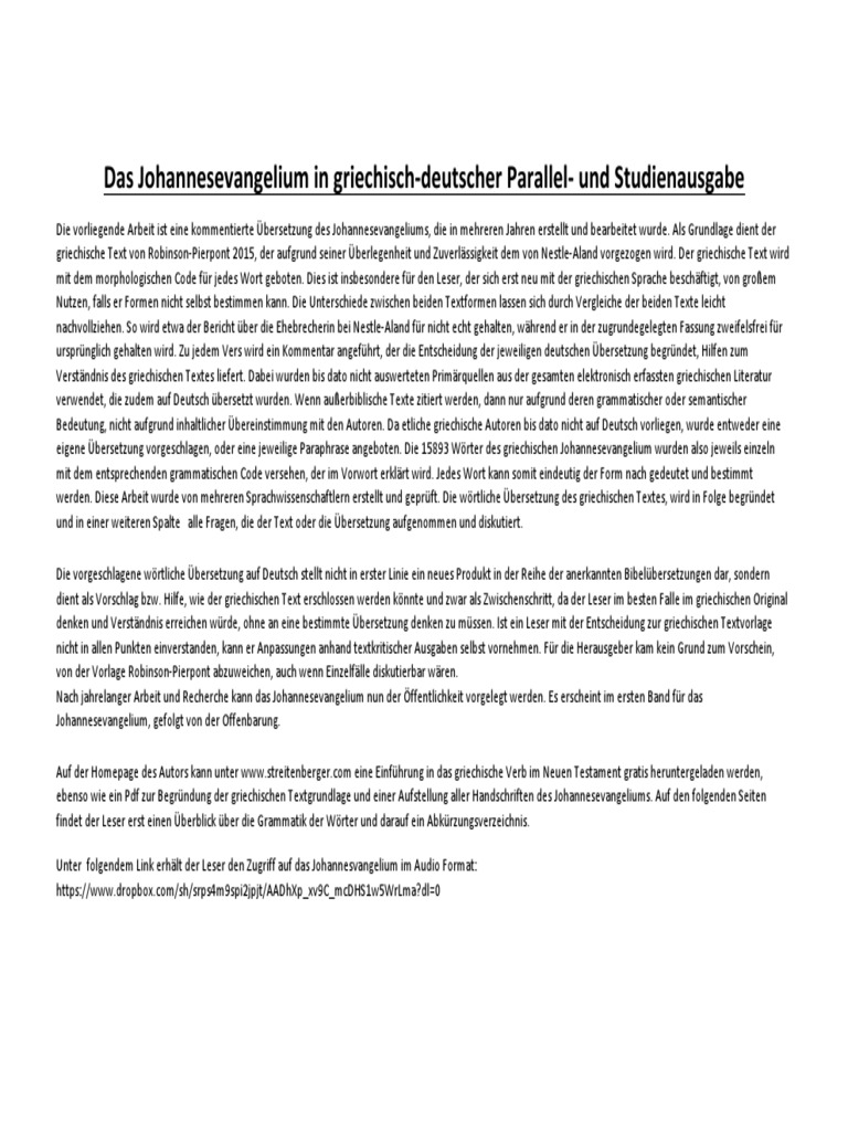 ebenso wie ein Pdf zur Begrndung der griechischen Textgrundlage und einer Aufstellung aller Handschriften des Johannesevangeliums. Auf den folgenden Seiten