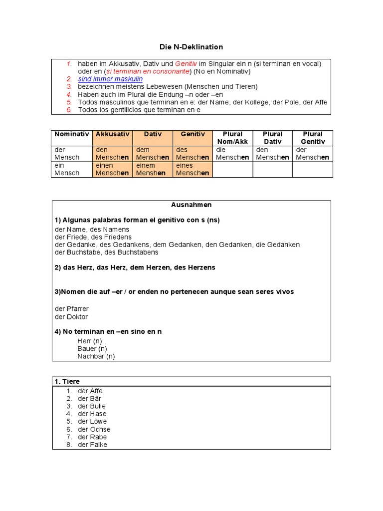 Das Dokument beschreibt die N-Deklination im Deutschen. Substantive der N-Deklination enden im Akkusativ, Dativ und Genitiv Singular häufig auf -n oder -en und bezeichnen oft Lebewesen wie Menschen oder Tiere. Es werden zahlreiche Beispiele für die Verwendung der N-Deklination sowie einige Ausnahmen aufgeführt.