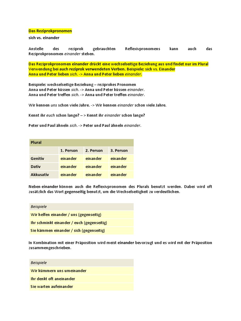 Das Reziprokpronomen einander drückt eine wechselseitige Beziehung aus und findet nur im Plural