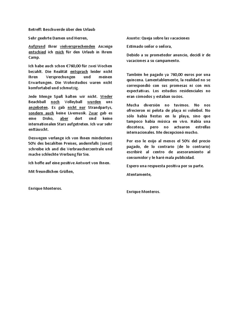 Sehr geehrte Damen und Herren, Asunto: Queja sobre las vacaciones