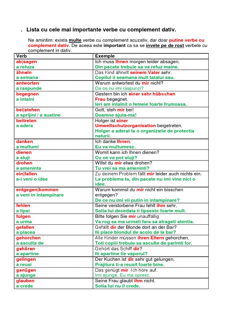 . Lista cu cele mai importante verbe cu complement dativ.
