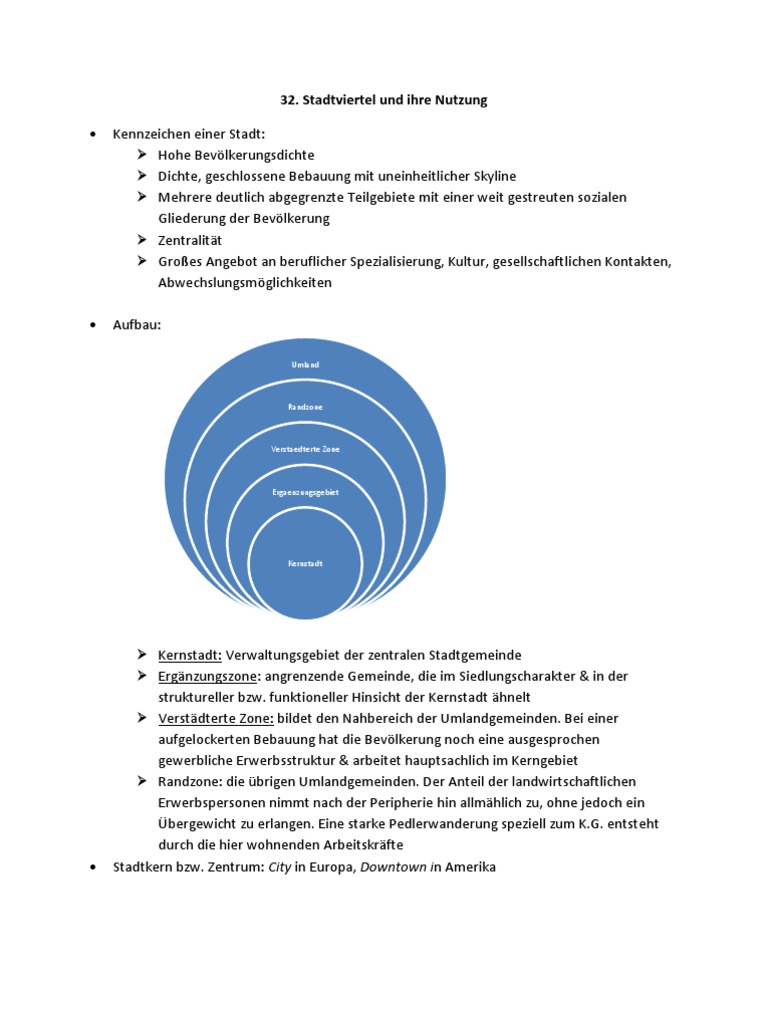 Zentrum (Kerngebiet) ist Hauptgeschfts- und Einkaufszentrum, oft der lteste Teil der Stadt In der City befinden sich: das Rathaus, die wichtigsten Banken, Arzt- und Anwaltspraxen; auerdem zahlreiche Kaufhuser & Fachgeschfte, kulturelle & Freizeiteinrichtungen wie Museen, Theater, Kinos, Cafs, Restaurants, Wohnungen finden sich im K.G. eher selten Die City dient nicht nur der Versorgung der Stadtbewohner; Einzelhandel und Dienstleistungen werden auch von den Bewohnern des Umlands wahrgenommen -> dabei gilt: je hoher und besser das Angebot, desto groer ist die Zentralitt der Stadt Zentrale Orte sind Siedlungen, die Mittelpunkt fr einen sie umgebundenen Bereich sind, den sie mit Waren & Dienstleistungen versorgen Ergnzungsgebiete: Gebiete, die von einem Zentrum versorgt werden Grundzentrum: Waren werden zur Deckung des tglichen Bedarf angeboten, es werden einfache Dienstleistungen bereitgestellt: z.B. kleinere Supermarkte, Fachgeschfte mit einer eher geringen Auswahl an Waren Mittelzentren besitzen bereits eine tiefer gehende Angebotsstruktur; Angebot & Umfang der Waren sind groer, darunter auch solche, die nicht tglich nachgefragt werden. Wie Bucher, Schuhgeschfte, Textilgeschfte, Mbel, Brillen,Es gibt noch Verwaltungseinrichtungen (Rathaus) & weiterfhrende Schulen & Fachrzte Oberzentren sind gekennzeichnet durch Universitten, ein breites Angebot kultureller Veranstaltungen, berregionale Verwaltungseinrichtungen, Fachkliniken, Waren an langfristigen Bedarf & Luxusguter bsp. Edelboutiquen. Gleichzeitig gilt, dass jedes Zentrum einer hheren Stufe auch das Waren- & Dienstleistungsangebot der niedrigeren Zentren umfasst Nordamerika: Einzelhandels- & Dienstleistungsviertel = CBD (Central Business District) Dem CBD fehlt ein historischer Stadtkern, stattdessen gibt es unzhlige Hochhuser (z.B. Manhattan) Im Anschluss an die City o. CBD liegen die ltesten, dicht bebauten Wohngebiete der Stadt Wegzug der stdtischen Bevlkerung ins Umland (Suburbs) -> Innenstdte & innenstadtnahe Bereiche: leere Wohnungen -> Mietpreise sinken -> seit den 70ern zuwandernde Gastarbeiten bzw. rmere Schicht zieht ein In USA: sozial schwache Bevlkerungsgruppen der ethnischen Minderheiten ziehen in die frei werdende innerstdtische Wohnviertel -> oft entstehen da Ghettos o. Slums (Brooklyn, Bronx) Je weiter man sich vom Stadtzentrum entfernt, umso lockerer wird die Bebauung -> erste derartige Siedlungen in Amerika: im 19. Jh., in Europa: Zwischenkriegszeit Das sind dann Villenviertel, Kleinwohnhauser mit groen Garten, Reihen- & Mehrfamilienhuser (Hvsvlgy?)