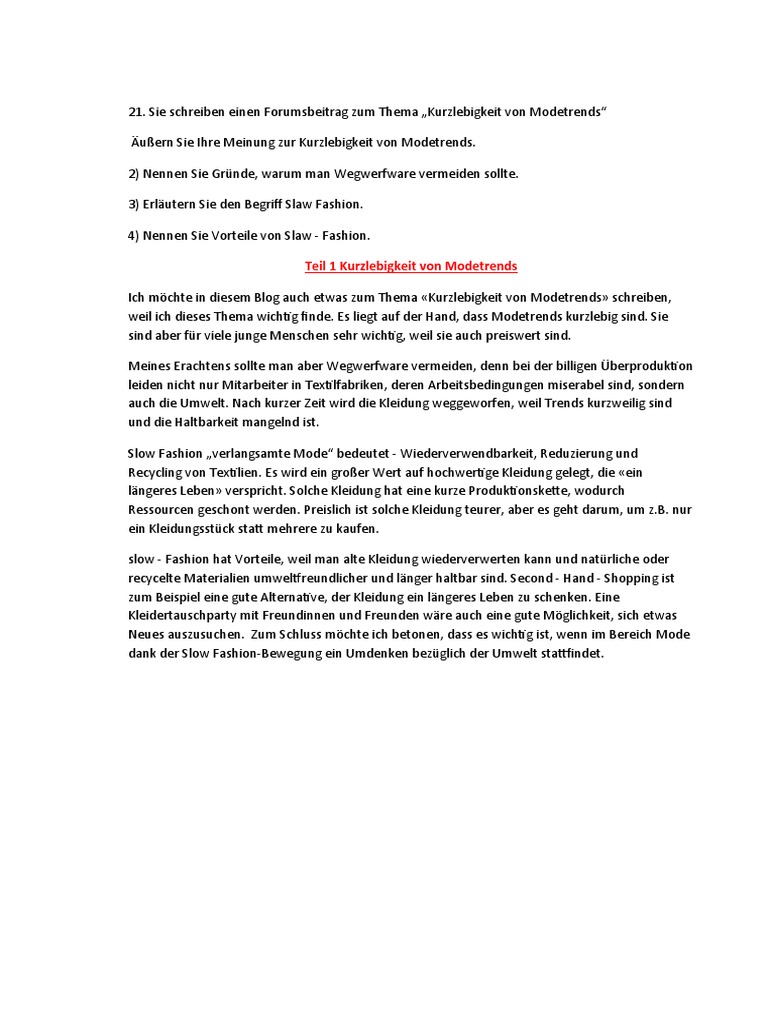 Der Text diskutiert die Kurzlebigkeit von Modetrends und plädiert für einen bewussteren Umgang mit Kleidung. Er erklärt den Begriff Slow Fashion, der längere Nutzung, Wiederverwendung und Recycling von Textilien bedeutet und dadurch Ressourcen schont.
