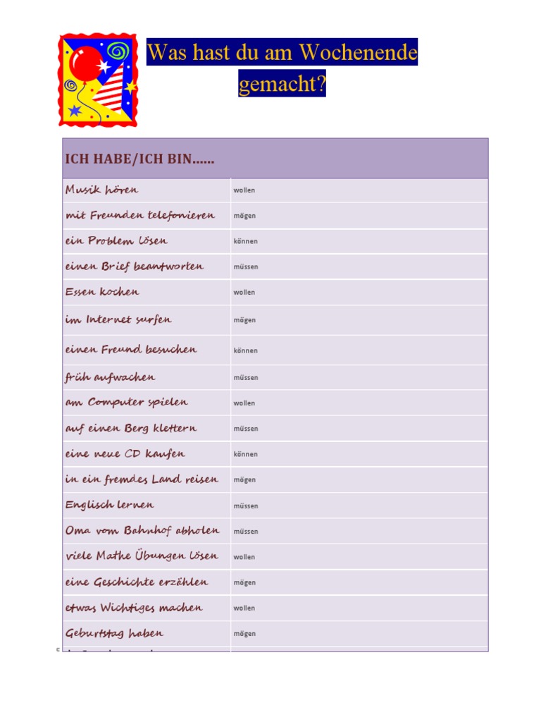 Das Dokument listet verschiedene Aktivitäten auf, die am Wochenende gemacht werden können, wie Musik hören, mit Freunden telefonieren oder einen Freund besuchen. Es werden jeweils Verben wie wollen, mögen oder müssen verwendet, um die Haltung zur Aktivität auszudrücken.