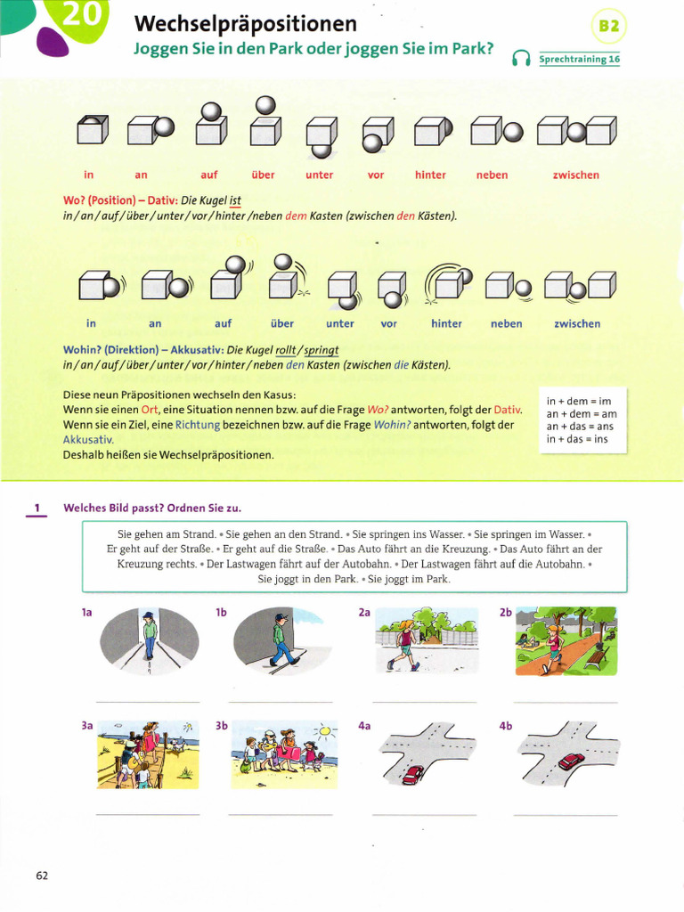 Er geht auf der Straße. • Er geht auf die Straße. • Das Auto fährt an die Kreuzung. • Das Auto fährt an der