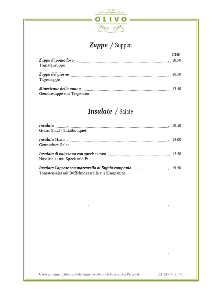 Gäste mit einer Lebensmittelallergie wenden sich bitte an das Personal. inkl. MwSt. 8.1%