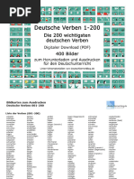 Das Dokument enthält eine Liste der 200 wichtigsten deutschen Verben mit ihren Bedeutungen und Beispielen, die als Bildkarten zum Ausdrucken für den Deutschunterricht oder für den Heimgebrauch gedacht sind. Es wird darauf hingewiesen, dass das Material urheberrechtlich geschützt ist und nicht weiterverbreitet werden darf. Zudem wird auf weitere Unterrichtsmaterialien und die Unterstützung der Arbeit des Deutschlernerblogs hingewiesen.
