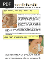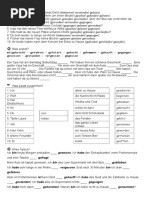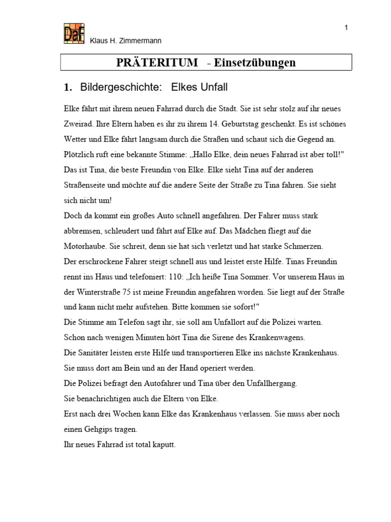 Das Dokument enthält eine Bildergeschichte über Elkes Unfall, bei dem sie mit ihrem neuen Fahrrad von einem Auto angefahren wird. Nach dem Unfall wird sie ins Krankenhaus gebracht, wo sie operiert werden muss, und ihr Fahrrad ist beschädigt. Es gibt auch Übungen zur Konjugation von Verben im Präteritum, die auf die Geschichte basieren.