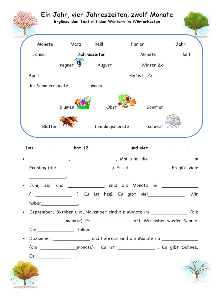 Das Dokument beschreibt die vier Jahreszeiten und die dazugehörigen Monate. Es nennt spezifische Monate für Frühling, Sommer, Herbst und Winter und beschreibt das Wetter und Aktivitäten in jeder Jahreszeit. Zudem werden Begriffe wie 'Blumen', 'Obst' und 'Blätter' erwähnt, die mit den Jahreszeiten verbunden sind.