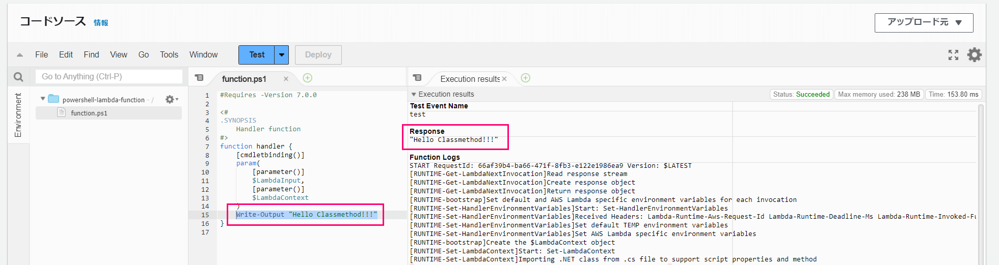 この状態で「Test」ボタンをクリックして動作確認するとスクリプト内のhandler関数が実行され「"Hello PowerShell!"」のレスポンスが返されます。