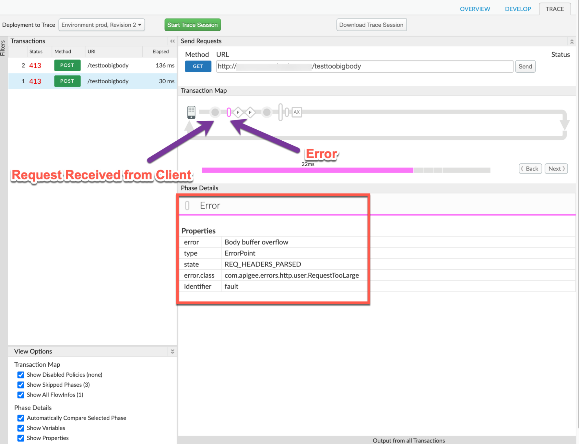 proxy, Kode Kesalahan memiliki nilaiprotocol.http.TooBigBody, dan Panjang Permintaan adalah kurang dari 10 MB, hal ini menunjukkan bahwa permintaan HTTP dari klien memiliki ukuran payload permintaan lebih rendah dari batas yang diizinkan dalam format terkompresi, tetapi ukuran payload lebih besar dari batas yang diizinkan saat tidak dikompresi oleh Apigee. - Kode Status: