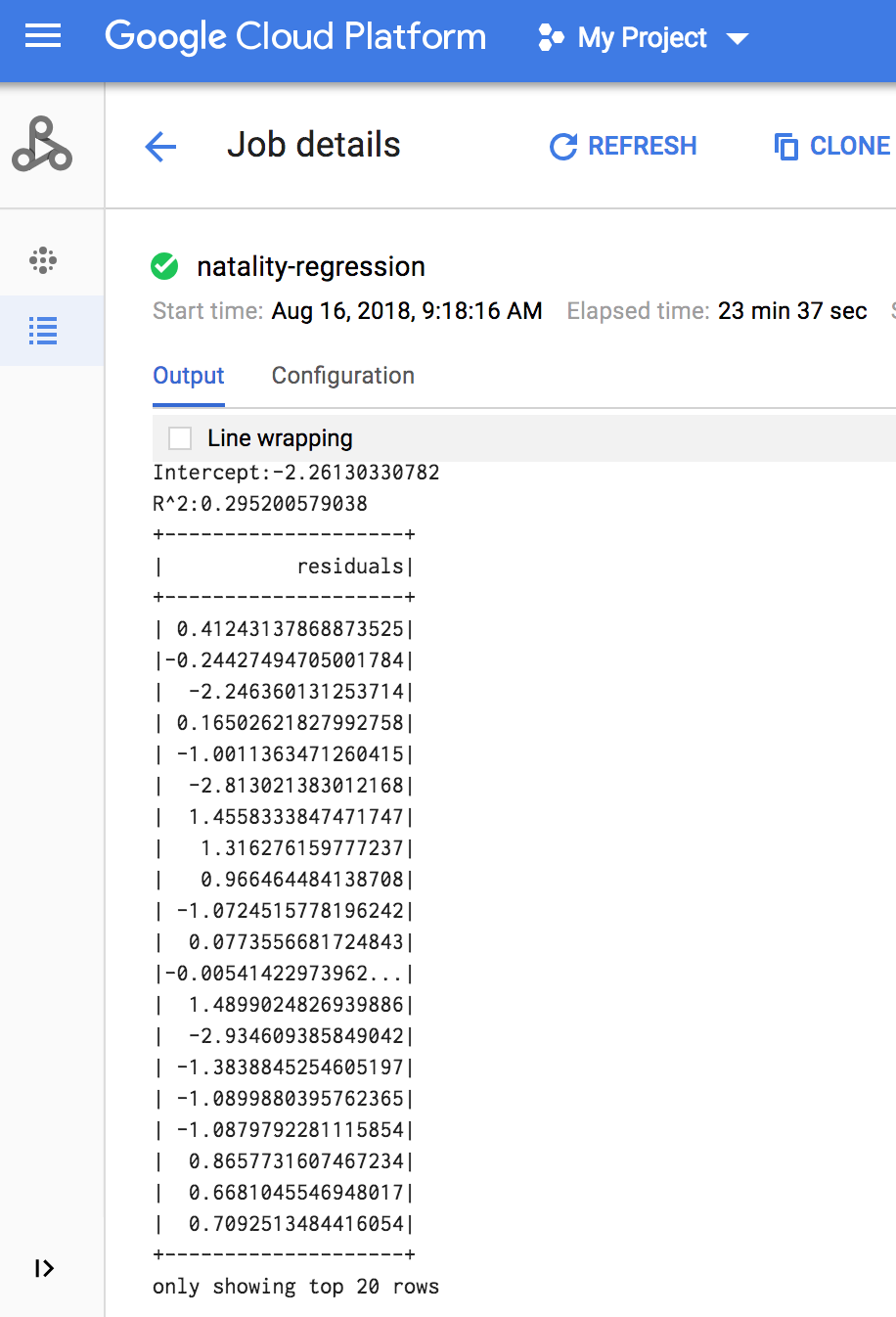 natality_sparkml.pyfile on your local machine."""Run a linear regression using Apache Spark ML. In the following PySpark (Spark Python API) code, we take the following actions: * Load a previously created linear regression (BigQuery) input table into our Cloud Dataproc Spark cluster as an RDD (Resilient Distributed Dataset) * Transform the RDD into a Spark Dataframe * Vectorize the features on which the model will be trained * Compute a linear regression using Spark ML """ from pyspark.context import SparkContext from pyspark.ml.linalg import Vectors from pyspark.ml.regression import LinearRegression from pyspark.sql.session import SparkSession # The imports, above, allow us to access SparkML features specific to linear # regression as well as the Vectors types. # Define a function that collects the features of interest # (mother_age, father_age, and gestation_weeks) into a vector. # Package the vector in a tuple containing the label (`weight_pounds`) for that # row. def vector_from_inputs(r): return (r["weight_pounds"], Vectors.dense(float(r["mother_age"]), float(r["father_age"]), float(r["gestation_weeks"]), float(r["weight_gain_pounds"]), float(r["apgar_5min"]))) sc = SparkContext() spark = SparkSession(sc) # Read the data from BigQuery as a Spark Dataframe. natality_data = spark.read.format("bigquery").option( "table", "natality_regression.regression_input").load() # Create a view so that Spark SQL queries can be run against the data. natality_data.createOrReplaceTempView("natality") # As a precaution, run a query in Spark SQL to ensure no NULL values exist. sql_query = """ SELECT * from natality where weight_pounds is not null and mother_age is not null and father_age is not null and gestation_weeks is not null """ clean_data = spark.sql(sql_query) # Create an input DataFrame for Spark ML using the above function. training_data = clean_data.rdd.map(vector_from_inputs).toDF(["label", "features"]) training_data.cache() # Construct a new LinearRegression object and fit the training data. lr = LinearRegression(maxIter=5, regParam=0.2, solver="normal") model = lr.fit(training_data) # Print the model summary. print("Coefficients:" + str(model.coefficients)) print("Intercept:" + str(model.intercept)) print("R^2:" + str(model.summary.r2)) model.summary.residuals.show()