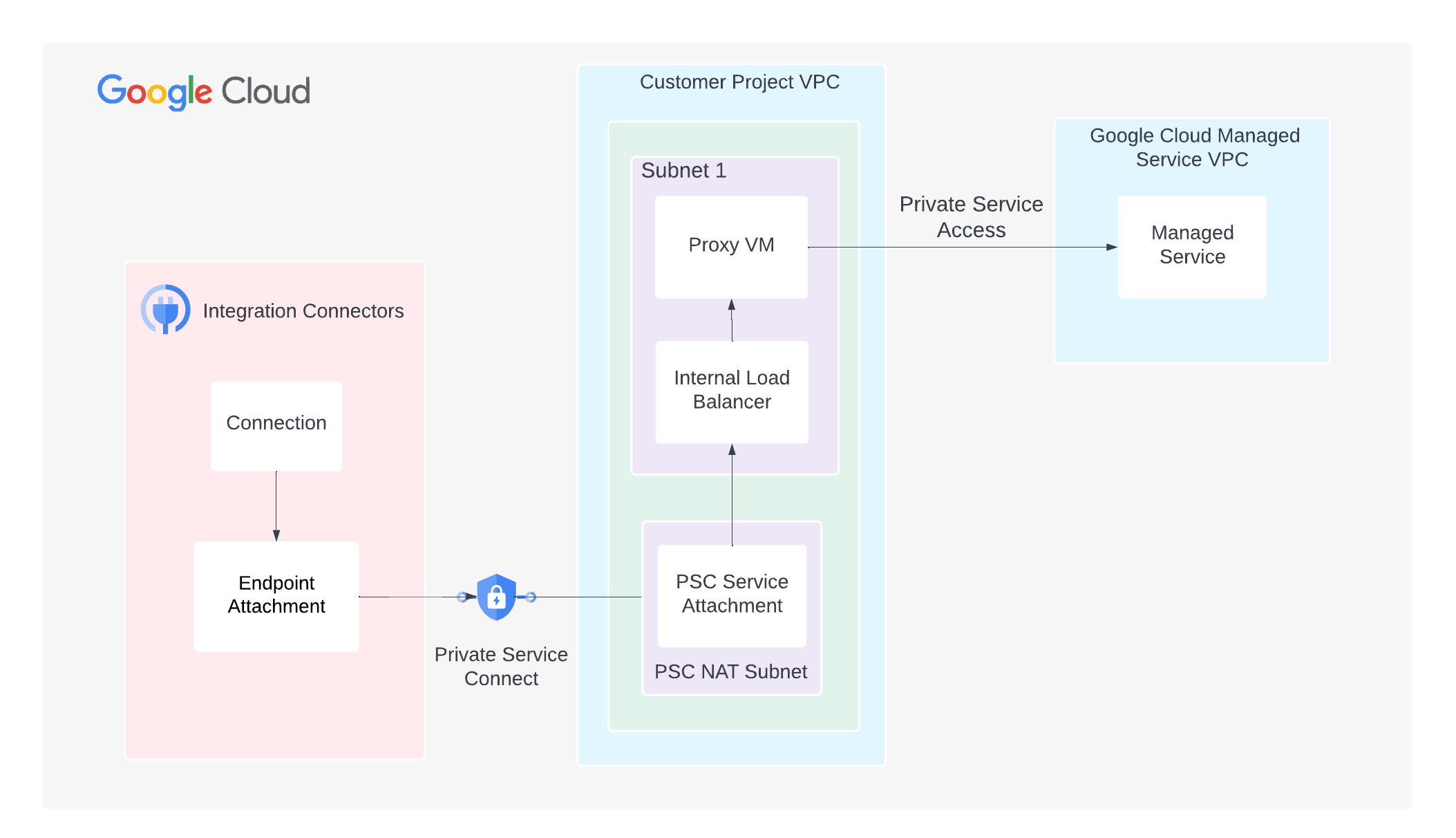 - The Google Cloud managed service exposes a service attachment but doesn't support allowlisting the Integration Connectors project to consume the service attachment.