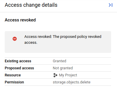 콘솔에 지난 90일 동안의 액세스 변경사항 표에 재생 오류가 나열됩니다. Google Cloud 각 오류의 액세스 변경 세부정보 패널에는 문제를 이해할 수 있도록 오류 메시지와 오류 발생 시 시뮬레이션된 리소스 및 권한이 포함되어 있습니다.