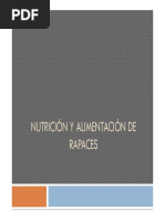 Se muele finamente el pltano y se le aade el alimento balanceado formando una papilla uniforme, la papaya se agrega en trozos y la croqueta completa al igual que el huevo hervido esparcido sobre la fruta. La carne de pollo, de preferencia el corazn sin grasa se colocar en un recipiente aparte y se les dar dos veces a la semana. Las cantidades antes mencionadas variarn dependiendo de la talla del ave. Aves carnvoras Por lo regular las aves carnvoras forman el grupo de las rapaces, tiene un amplia gama de especies con diferentes tipos de alimentacin. Hay especies cuya dieta es especfica, como el halcn peregrino (Falco peregrinos), tpicamente ornitfago, o el milano negro (Rosthramus sociabilis) que se alimenta exclusivamente de caracoles de agua dulce. Las cantidades que consumen estas aves son muy variables, el guila real ( Aquila chrysaetos) llega a consumir de 500 a 900 gr; un cerncalo (Falco sparverius) llega a consumir de 70 a 100 gr. Mencionaremos las dietas para algunas especies de falconiformes que se han podido mantener en cautiverio. Esta dieta es aplicable para el halcn colarroja (Buteo jamaicensis), halcn de Swainson (Buteo swainsonii), aguililla caminera (Buteo magnirostris), aguililla gris (Buteo nitidus), caracara (Polyborus plancus), aguililla aura (Buteo albonotatus), y cerncalo (Falco sparverius). Frmula Cabeza de pollo con pescuezo (sin grasa ni piel) Conejo (carne y piel con pelo) Paloma (carne y piel con pluma) La cantidad que daremos ser variable y salteada; es decir, un da daremos la cabeza con pescuezo, al da siguiente daremos conejo, y al siguiente paloma. Podemos combinar pollo