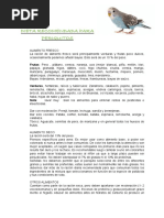 La fruta se dar en trozos, se recomienda especialmente la papaya, pues otra fruta no la aceptaran las palomas tropicales. Passeriformes. Las passeriformes son el grupo u orden ms grande de todas las aves, incluye a los pjaros tpicos de diversos hbitos, costumbres, alimentacin y hbitats. El pico de las passeriformes nos dice mucho acerca de su alimentacin. Tenemos passeriformes de pico cnico y grueso , tpicamente granvoras; las de pico delgado son de hbitos insectvoros; y los mixtos, que se alimentan tanto de insectos, semillas y fruta. En este grupo identificaremos dos tipos de dietas que no varan en cuanto a los ingredientes, sino en la cantidad de stos. La siguiente dieta se aplica en aves granvoras pequeas como el cubanito (Volantina jacarina), chatito (Sporophila torqueola), gallito (Tiaris olivacea) y los gneros Spizella, Aimophiia, Passerina, Carduelis, Carpodacus; diamantes del gnero Taeniopygia, Lonchura, Padda, Poephilia; canario (Serinus canaria) chilln (Passer domesticus). El tamao vara de los 9 a los 12 cm. Frmula Alpiste Mijo (blanco y rojo) Nger Avena quebrada Germinado de leguminosa (puede ser tambin lechuga o espinaca) Pan blanco o integral Huevo hervido Manzana o pera