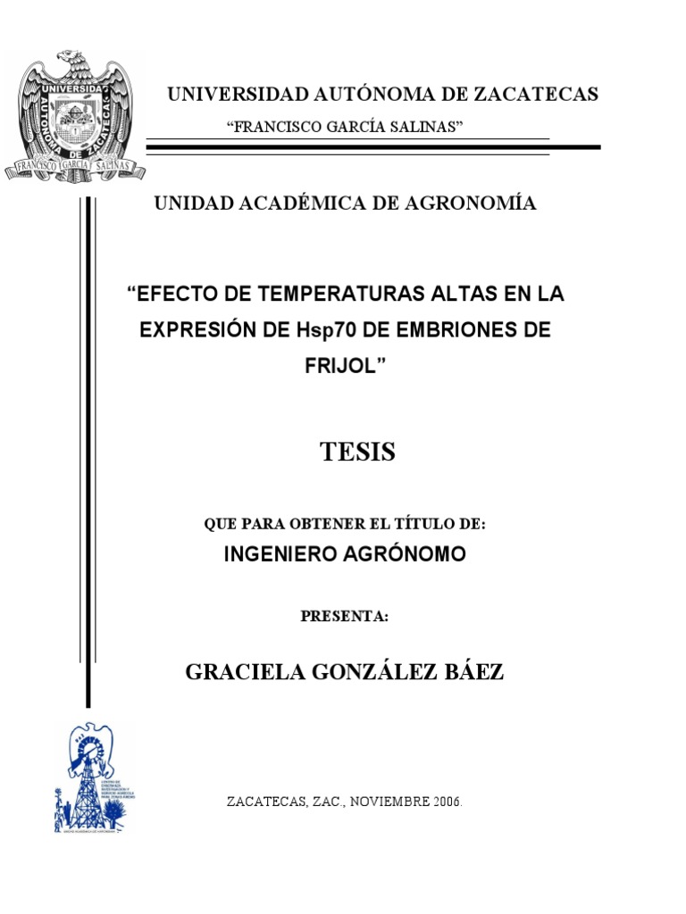 Este documento presenta una tesis de Graciela González Báez sobre el efecto de las altas temperaturas en la expresión de la proteína Hsp70 en embriones de frijol. La tesis fue realizada en la Universidad Autónoma de Zacatecas con el apoyo financiero de diversas instituciones. El documento introduce el tema explicando la importancia del cultivo de frijol en México y Zacatecas, y los retos que plantean factores ambientales como las altas temperaturas. También describe la respuesta al estrés por calor a nivel