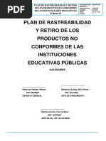 Este documento presenta un plan de rastreabilidad y retiro de productos no conformes. El plan tiene como objetivo identificar el origen y destino de los productos desde el almacenamiento hasta su entrega final, y establecer un sistema para registrar datos que permita identificar y potencialmente retirar lotes de productos que representen un riesgo para la salud. El plan espera lograr un mayor control y seguridad en la cadena de suministro de alimentos.