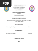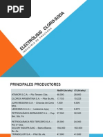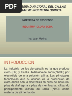 El documento describe el proceso de producción de cloro, hidrógeno, soda cáustica y ácido clorhídrico a partir de la salmuera obtenida de la evaporación del agua de mar. Se explica que la salmuera es sometida a electrolisis para separar los iones de cloro y sodio, produciéndose cloro gaseoso, hidrógeno y amalgama de sodio-mercurio. La amalgama se descompone para producir soda cáustica, mientras que el cloro y el hidrógeno reaccionan para