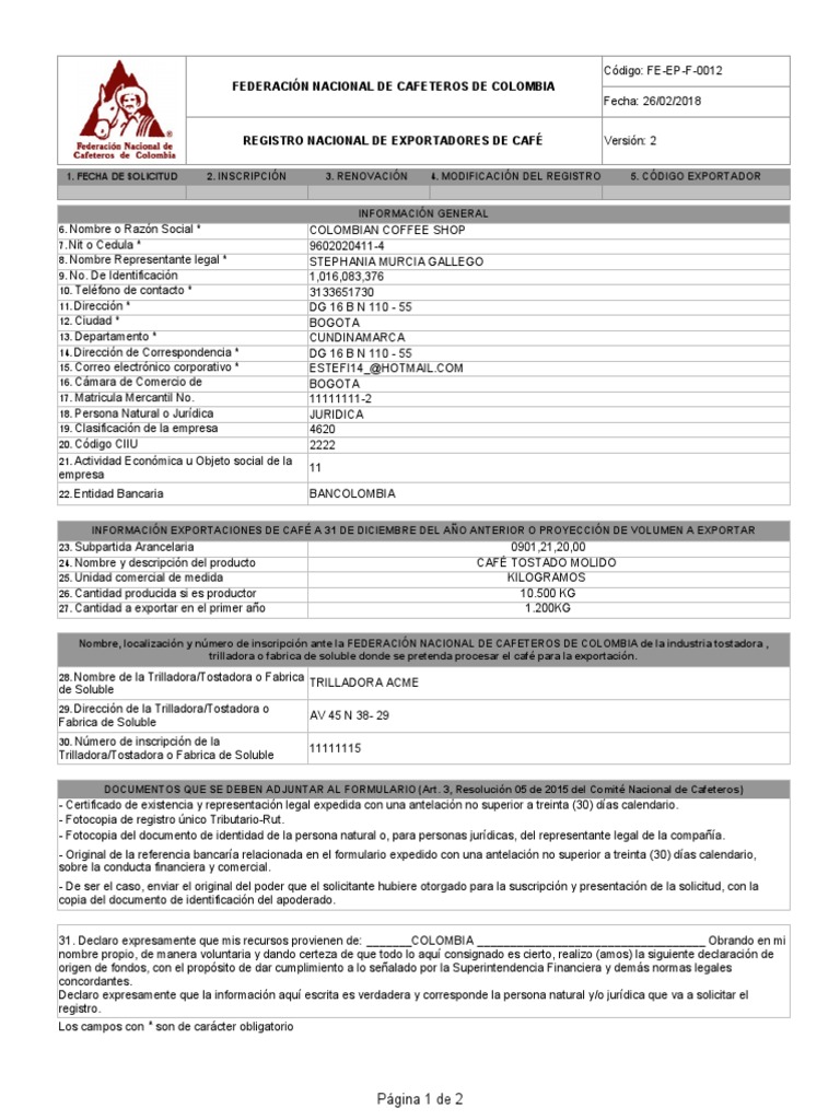 Formulario Registro Nacional Exportadores de Cafe B