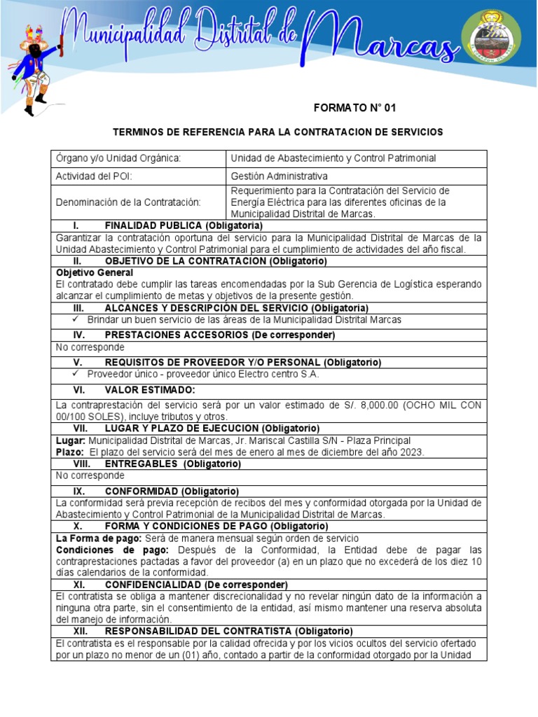 Garantizar la contratación oportuna del servicio para la Municipalidad Distrital de Marcas de la