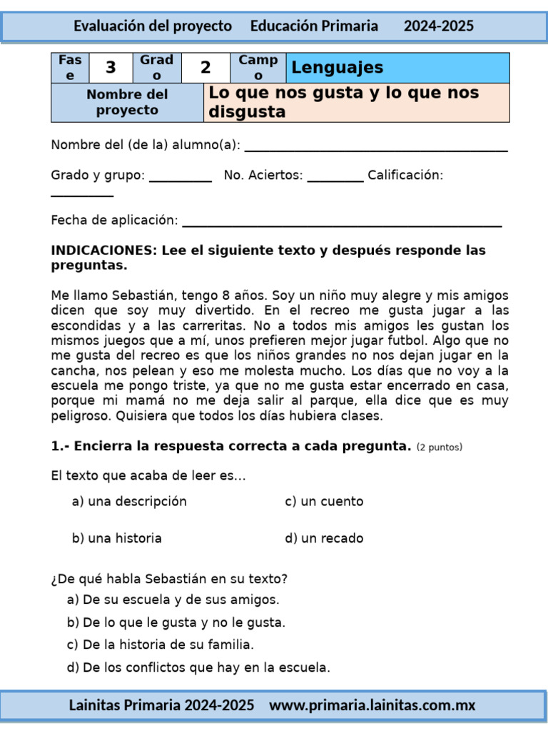 2do Grado Septiembre - Examen 05 Lo Que Nos Gusta y Lo Que Nos Disgusta (2024-2025)