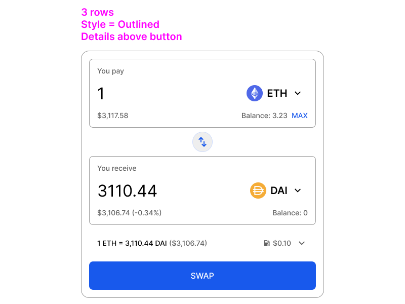 On the second field (the one where you choose the token you are swapping to) you can also include the price impact next to the fiat currency amount, by calculating the difference between the input amount and estimated output amounts. This is quite a useful detail to include.