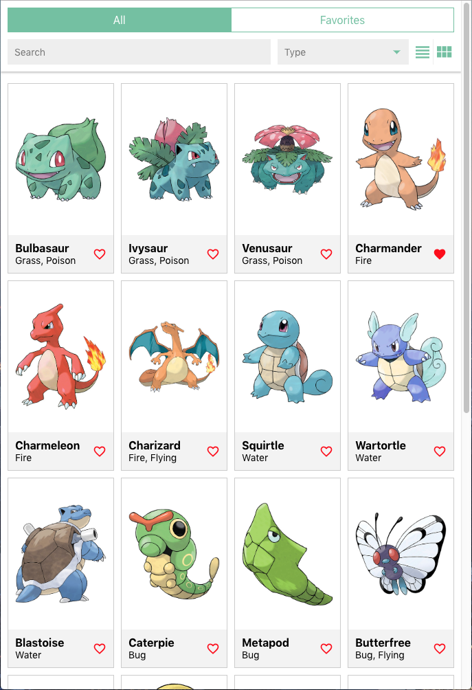 AllPokemon andFavoritePokemon views. - Change the view from either a grid or list.