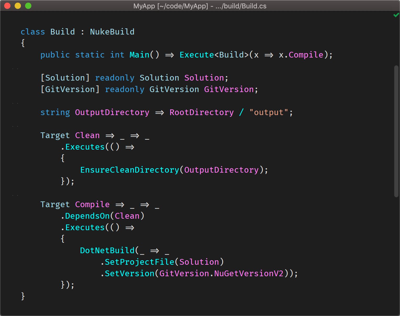 NUKE brings your build automation to an even level with every other .NET project. How? It's a regular console application allowing all the OOP goodness! Besides, it solves many common problems in build automation, like parameter injection, path separator abstraction, access to solution and project models, and build step sharing across repositories. NUKE can also generate CI/CD configurations (YAML, etc.) that automatically parallelize build steps on multiple agents to optimize throughput!