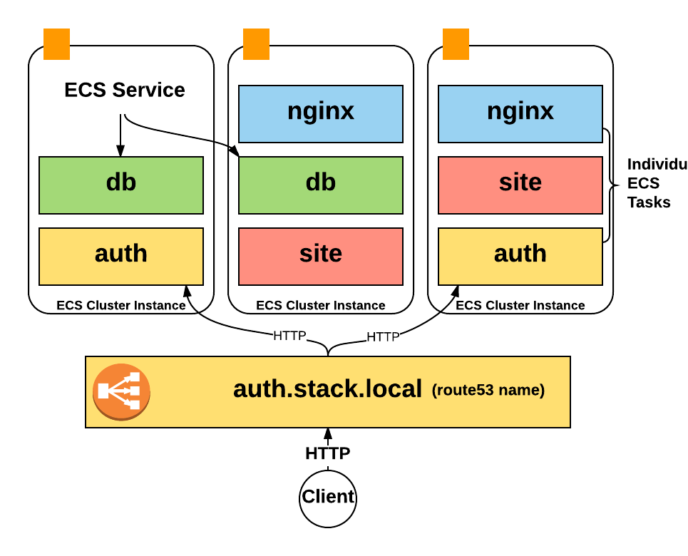 At a high level, the Stack creates a multi-az VPC, a single auto-scaling cluster, and service definitions within ECS.