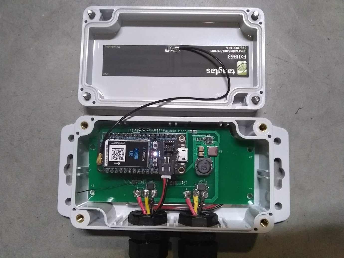 The Simple IoT hardware currently consists of a gateway with a Feather socket that works with modules from Particle and Adafruit. Multiple sensor/IO nodes can be attach to the gateway and daisychained for 10's of feet. The system is waterproof and uses low cost xConnect 3-wire connectors.
