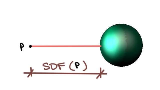}Given a point p we can use an SDF to quickly determine the distance between that point and the nearest surface defined by that SDF.