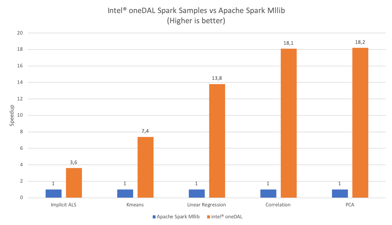 oneDAL library is used for Spark MLlib acceleration as part of OAP MLlib project and allows you to get a 3-18x increase in performance compared to the default Apache Spark MLlib.