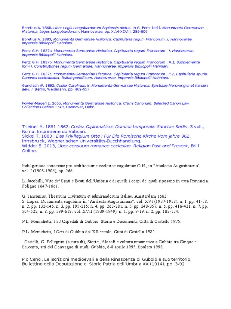 Boretius A. 1868, Liber Legis Longobardorum Papiensis dictus , in G. Pertz(ed.), Monumenta Germaniae Historica. Leges Longobardorum, Hannoverae, pp. XLVI-XCVIII, 289-606 Monumenta Germaniae Historica. Legum sectio II: Capitularia regum Francorum, Hannoverae, Impensis Bibliopolii Hahniani [http://archive.org/details/monumentagermani00geseuoft] Boretius A. 1883, Monumenta Germaniae Historica. Capitularia regum Francorum, Hannoverae, Impensis Bibliopolii Hahniani [http://archive.org/details/monumentagermani00geseuoft] Gundlach W. 1892, Codex Carolinus, in Monumenta Germaniae Historica. Epistolae Merowingici et Karolini aevi, vol. 1, Berlin, Weidmann, pp. 469-657.