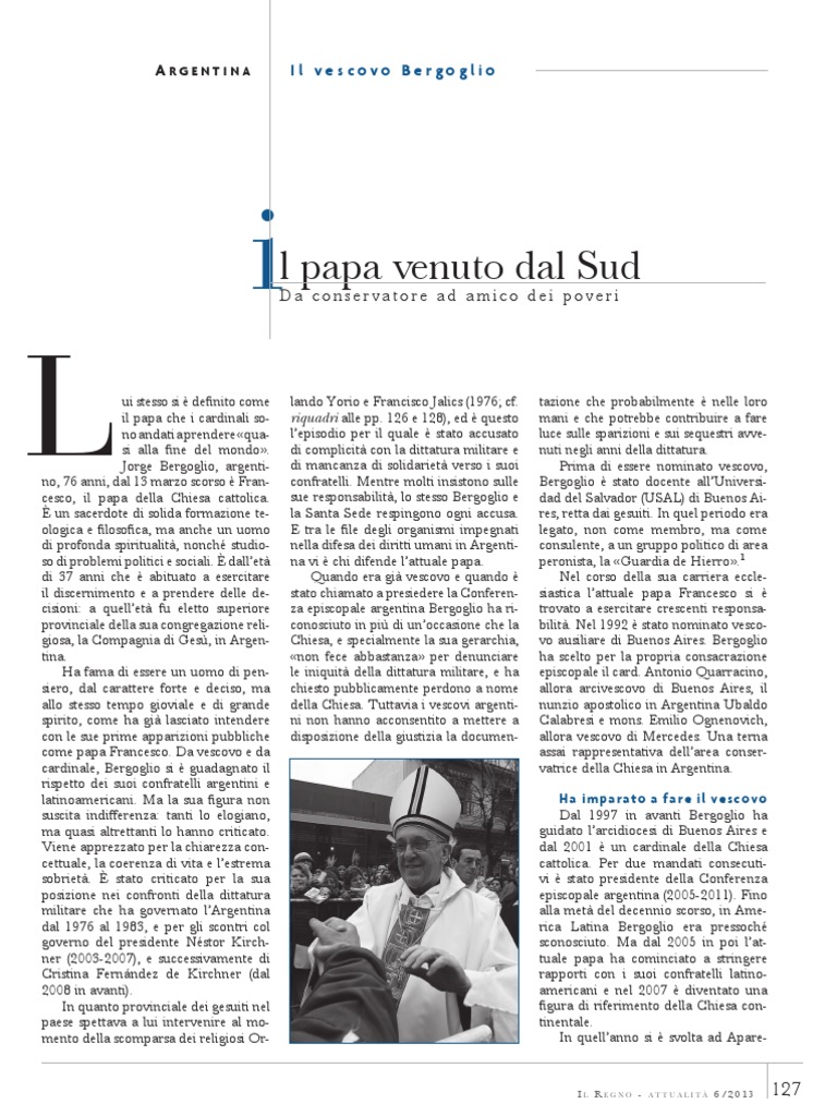 ui stesso si definito come il papa che i cardinali sono andati a prendere quasi alla fine del mondo. Jorge Bergoglio, argentino, 76 anni, dal 13 marzo scorso Francesco, il papa della Chiesa cattolica. un sacerdote di solida formazione teologica e filosofica, ma anche un uomo di profonda spiritualit, nonch studioso di problemi politici e sociali. dallet di 37 anni che abituato a esercitare il discernimento e a prendere delle decisioni: a quellet fu eletto superiore provinciale della sua congregazione religiosa, la Compagnia di Ges, in Argentina. Ha fama di essere un uomo di pensiero, dal carattere forte e deciso, ma allo stesso tempo gioviale e di grande spirito, come ha gi lasciato intendere con le sue prime apparizioni pubbliche come papa Francesco. Da vescovo e da cardinale, Bergoglio si guadagnato il rispetto dei suoi confratelli argentini e latinoamericani. Ma la sua figura non suscita indifferenza: tanti lo elogiano, ma quasi altrettanti lo hanno criticato. Viene apprezzato per la chiarezza concettuale, la coerenza di vita e lestrema sobriet. stato criticato per la sua posizione nei confronti della dittatura militare che ha governato lArgentina dal 1976 al 1983, e per gli scontri col governo del presidente Nstor Kirchner (2003-2007), e successivamente di Cristina Fernndez de Kirchner (dal 2008 in avanti). In quanto provinciale dei gesuiti nel paese spettava a lui intervenire al momento della scomparsa dei religiosi Or-