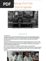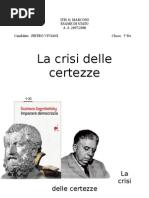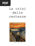 LOttocento stato un secolo fortemente caratterizzato da una concezione salda dellio, in quanto luomo attribuiva alla sua soggettivit, un dominio assoluto sulla propria coscienza, sul proprio corpo e sulla natura. Ma alla fine dellOttocento si avvert sempre pi profondamente un forte disagio sociale, che si ripercosse anche a livello individuale. Lio assoluto comincia a vacillare e nel primo novecento la crisi esplode: la crisi delle certezze. Tale crisi investir tutti i campi, filosofia, scienza, letteratura, e si ripercuoter pesantemente sulla societ modificandone la mentalit. Il primo filosofo che annunci la crisi fu Schopenhauer (1788-1860) il quale perviene alla riduzione delluomo ad una inconscia, incontrollabile, infinita volont, la volont di vita (ville zum leben). Essa, manifestandosi sotto forma di bisogni e pulsioni,determina ogni azione delluomo, tutto il suo agire. Lo scopo delluomo lo scopo della volont stessa, che quello di perseguire se stessa, di affermarsi come pura volont di vivere. Lunica via di liberazione delluomo la soppressione di questa volont, ovvero la noluntas, la rinuncia allio. Cade con Schopenhauer la definizione di uomo come animale razionale in quanto ogni suo pensiero e ogni sua azione non sono consapevolmente e razionalmente decisi, ma istintivamente determinati. Sulla scia di Schopenhauer, Nietzsche (1844-1900), individua i due impulsi primordiali che determinano lio: lapollineo e il dionisiaco. Il primo costituisce la parte razionale dell'uomo, ordinata, armonica ed equilibrata mentre il secondo costituisce la parte irrazionale e disordinata. Freud (1856-1939), nella sua 2 topica individua 3 parti che costituiscono lessere, cos perfino il senso dellio soggetto a disturbi e i suoi confini non sono stabili (Il disagio della civilt, 1971). Lio una povera cosa che soggiace a un triplice servaggio e che pena sotto le minacce di un triplice pericolo: il pericolo che incombe dal mondo esterno, dalla libido dell'Es e dal rigore del Super-io. Bergson (1859-1941) definisce lio come lincessante progredire del passato che intacca lavvenire e che progredendo si accresce. Noi siamo infatti la sintesi della nostra storia. La storia passata di ogni uomo ne determina la personalit e gli atteggiamenti, talvolta in modo inconscio. Noi siamo durata, non istante: lalternativa rispetto a Nietzsche posta in modo clamoroso. Ed posta anche per quel che riguarda la questione religiosa: non vero che Dio morto, anzi esattamente la coscienza,, il luogo dellio che permette alluomo di intuire la presenza di Dio. Altrimenti la morte di Dio porterebbe con s anche la morte delluomo. Luigi Pirandello (1867-1936) propone in modo forte ed innovativo un fatto che consequenziale alle visioni filosofiche di quel periodo: la dissoluzione, la frammentazione dellio. Il vitalismo di Pirandello lo porta a vedere la realt, la vita, come un processo in continuo fluire, continuo divenire, in cui luomo immerso e tenta disperatamente di fissarsi in delle forme. Se fossimo liberi da ogni regola, da ogni coscienza, seguiremmo pedissequamente i nostri istinti, le nostre volont (Les, la ville zum leben, lo spirito dionisiaco), ma ci non possibile nella societ in cui viviamo che stabilisce dei regole, a cui non vorremmo soggiacere (noluntas), e quindi ci costruiamo delle maschere, per raggiungere una determinata forma e poterci identificare in un modello, da noi stessi creato e bene accetto da noi e dagli altri (il super-io). Luomo finisce per assumere una serie di maschere, e non sa pi chi . E rappresentato dalla sua parte irrazionale e pulsionale o dal modello che esso mira ad essere? E rappresentato dallimmagine che egli ha di s stesso o dallimmagine che gli altri hanno di lui? Nella prima met del Novecento, la crisi dell'io esplode: la crisi dellidentit borghese. La coscienza che il soggetto, che lio ha di se stesso, della sua 'identit, lo porta a domandarsi: chi sono? Persa ogni fiducia nella religione (Nietzsche definisce Dio la nostra pi lunga menzogna), nella ragione e nella scienza resta un uomo contraddistinto dallincertezza, senza sicurezze. La rincorsa al successo economico da ottenere senza troppe remore etiche e la vita vissuta all'insegna del divertimento sfrenato portano l'uomo a provare penosi sentimenti di solitudine, di noia, di insicurezza, di vuoto esistenziale, di profondo disorientamento morale. Questo fatto paradossalmente acuito, anzich lenito, dalla libert di cui gode l'uomo contemporaneo, dalla molteplicit di opzioni fra cui chiamato a scegliere, in assoluta solitudine, senza riferimenti certi, senza guide che non siano il profitto economico e l'interesse personale. Viviamo oltretutto in un epoca di trasformazioni vertiginose, di cambiamenti repentini, di complessit crescenti che esigono capacit di risposta non comuni e che rischiano di schiacciare l'individuo facendolo sentire ancora pi impotente ed insicuro. Inoltre, negare, o almeno comprimere, la parte spirituale dell'uomo, porta a recrudescenza tutta una serie di mali sociali: la criminalit, il suicidio, la violenza, l'alcolismo, la droga, le cosiddette "malattie mentali".
