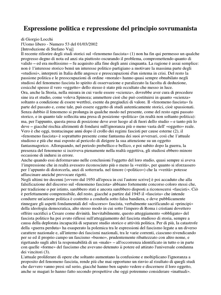 riflessi politici, per chi aderisca al "principio" sovrumanista, delle conclusioni di Locchi;