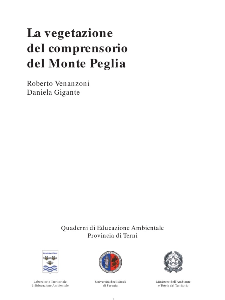 Bibliografia essenziale Barsali E., 1929-1933. Prodromo della Flora umbra. N. Giorn. Bot. Ital, n.s., 36: 548623; 38 (4): 624-689; 39 (2): 346-415; 39 (3): 549-598; 40 (3): 338-341. Batelli A., 1886. Prima contribuzione sulla Flora Umbra. Ann. Univ. Lib. di Perugia, 1(1): 3-56. Batelli A., 1887. Seconda contribuzione alla Flora Umbra. Ann. Univ. Lib. di Perugia, 2 (1): 137-248. Batelli A., 1888. Flora Umbra. Terza contribuzione. Ann. Univ. Lib. di Perugia, 3 (2): 29-46. Bellini R., 1899. Contribuzione alla Flora dellUmbria. N. Giorn. Bot. Ital, n.s., 6 (4): 357-367. Biondi E., 1994. The phytosociological approach to landscape study. Ann. Bot., 52: 134-141. Biondi E., 1996. La geobotanica nello studio ecologico del paesaggio. Ann. Acc. It. Sci. For., 45: 3-39. Firenze. Biondi E., 1996. Lanalisi fitosociologica nello studio integrato del paesaggio. Avances en Fitosociologa: 13-22. Braun-Blanquet J., 1928. Pflanzensoziologie. Grundzge der Vegetationskunde. 1 Ed. Berlin. Calestani V., 1907. La vegetazione dei dintorni di Orvieto. N. Giorn. Bot. Ital., n.s., 14 (4): 546-574. Conti F., Manzi A., Pedrotti F., 1997. Lista Rossa regionale delle piante dItalia. WWF, SBI. Crescentini R., Klaver J.M.I., 1997. Orchidee spontanee della Provincia di Pesaro e Urbino con osservazioni sulle specie delle Marche. Quaderni dellAmbiente. Provincia di Pesaro e Urbino. De Capite L., Menghini A., 1975. Flora officinale del monte Peglia (Umbria). Ann. Fac. Agr. Univ. Perugia, 29: 65-101. Farnesi R.M., Menghini A., Pagiotti R., 1998. Il Monte Peglia polmone verde dellumbria. Grilligraf. Ghu J.M., 1980. La phytosociologie daujourdhui. Not. Fitosoc., 16: 1-16. Ghu J. M., 1987. Des complexes de groupements vegetaux a la phytosociologie paysagere contemporaine. Inf. Bot. It., 18 (1-2-3): 53-83. Firenze. Ghu J.M., 1988. Lanalyse symphytosociologique et geosymphytosociologique de lespace. Theorie et methodologie. Coll. Phytosoc., 17: 11-46. Gigante D., 2001. Studio fitosociologico integrato del comprensorio del M. Peglia (Foglio 322 della Carta dItalia) con cartografia della vegetazione in scala 1: 50.000. Tesi di Dottorato, Universit degli Studi di Perugia, A.A. 2000-2001.