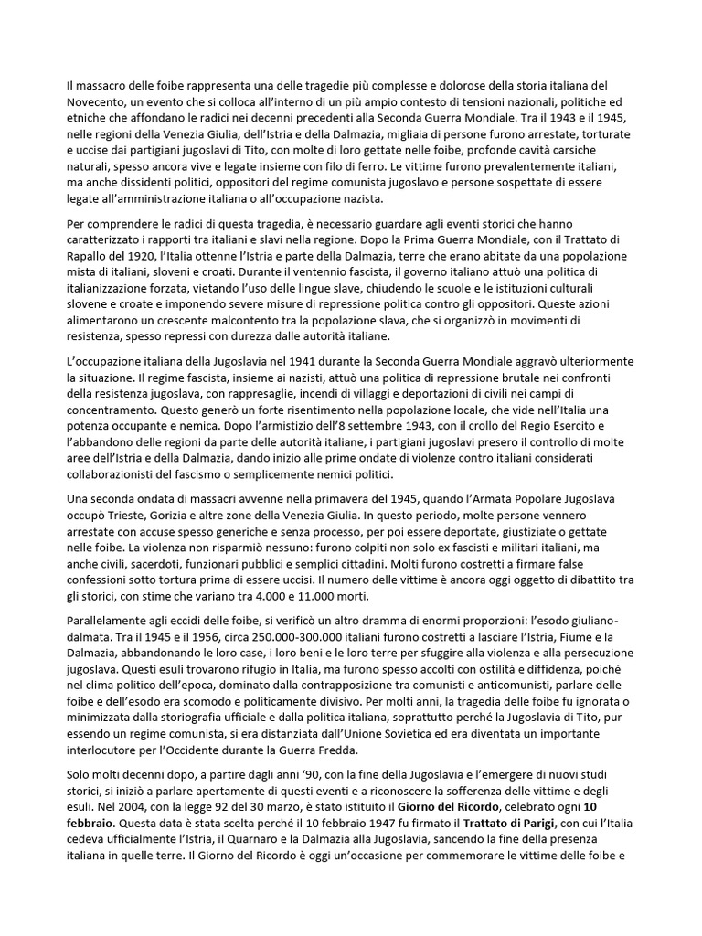 Il massacro delle foibe rappresenta una delle tragedie più complesse e dolorose della storia italiana del